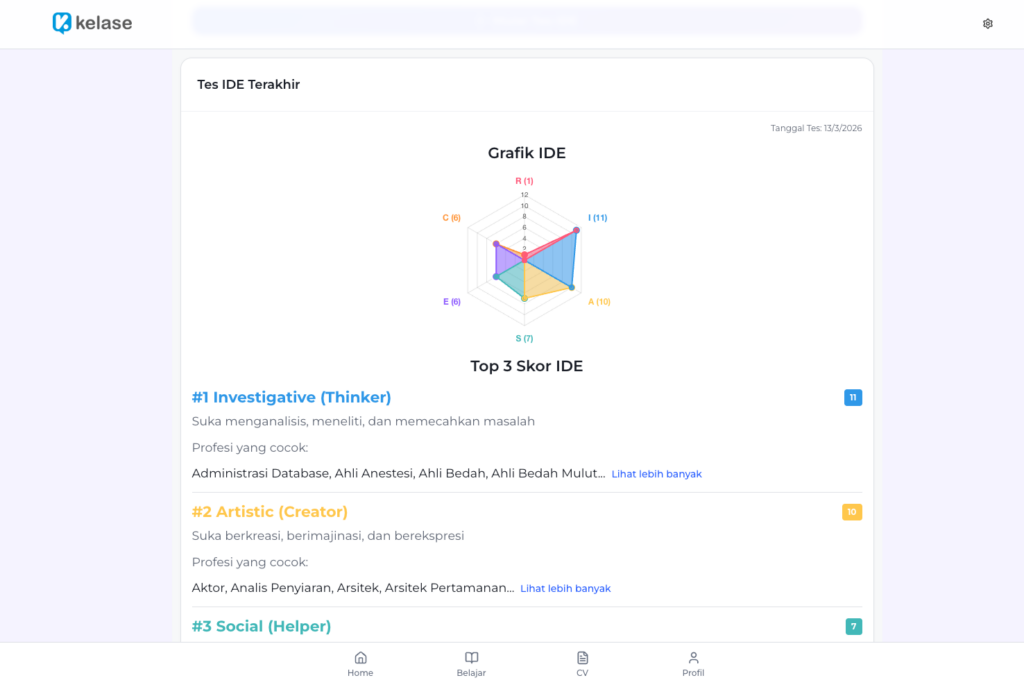 Melalui serangkaian asesmen berbasis AI, siswa dapat mengeksplorasi minat, bakat, hingga profil kepribadian mereka. Kelase menyediakan berbagai instrumen seperti pemetaan minat karir, analisis gaya belajar, hingga pengukuran kemampuan berpikir dan kesiapan akademik. Hasil dari asesmen ini tidak berhenti pada angka atau grafik, tetapi diterjemahkan menjadi rekomendasi yang konkret dan mudah dipahami.